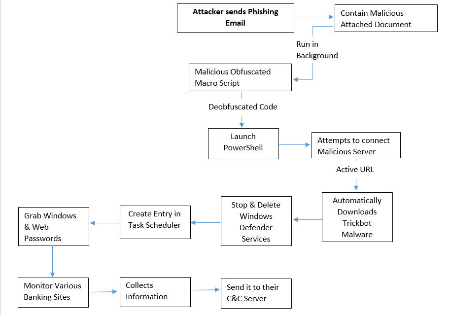 An attachment contains a malicious document contains an obfuscated malicious macro script that attempts to connect their C&C server to automatically downloads the Trickbot malware in the background on the user’s machine with the help of PowerShell.